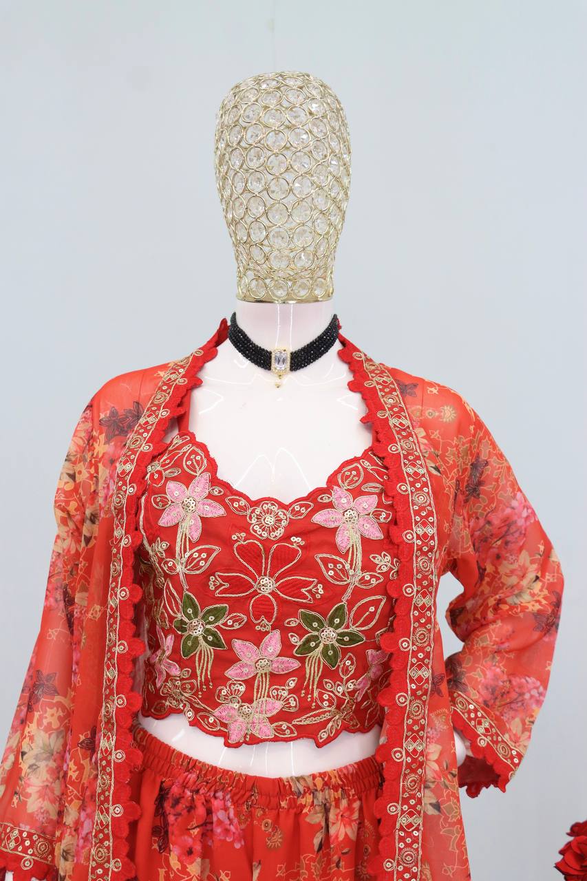 Step into effortless glamour with this stunning red three-piece ensemble that beautifully blends traditional charm with modern flair. The outfit features a delicately embroidered floral crop blouse paired with flowy high-waisted palazzo pants, creating a graceful and flattering silhouette.
