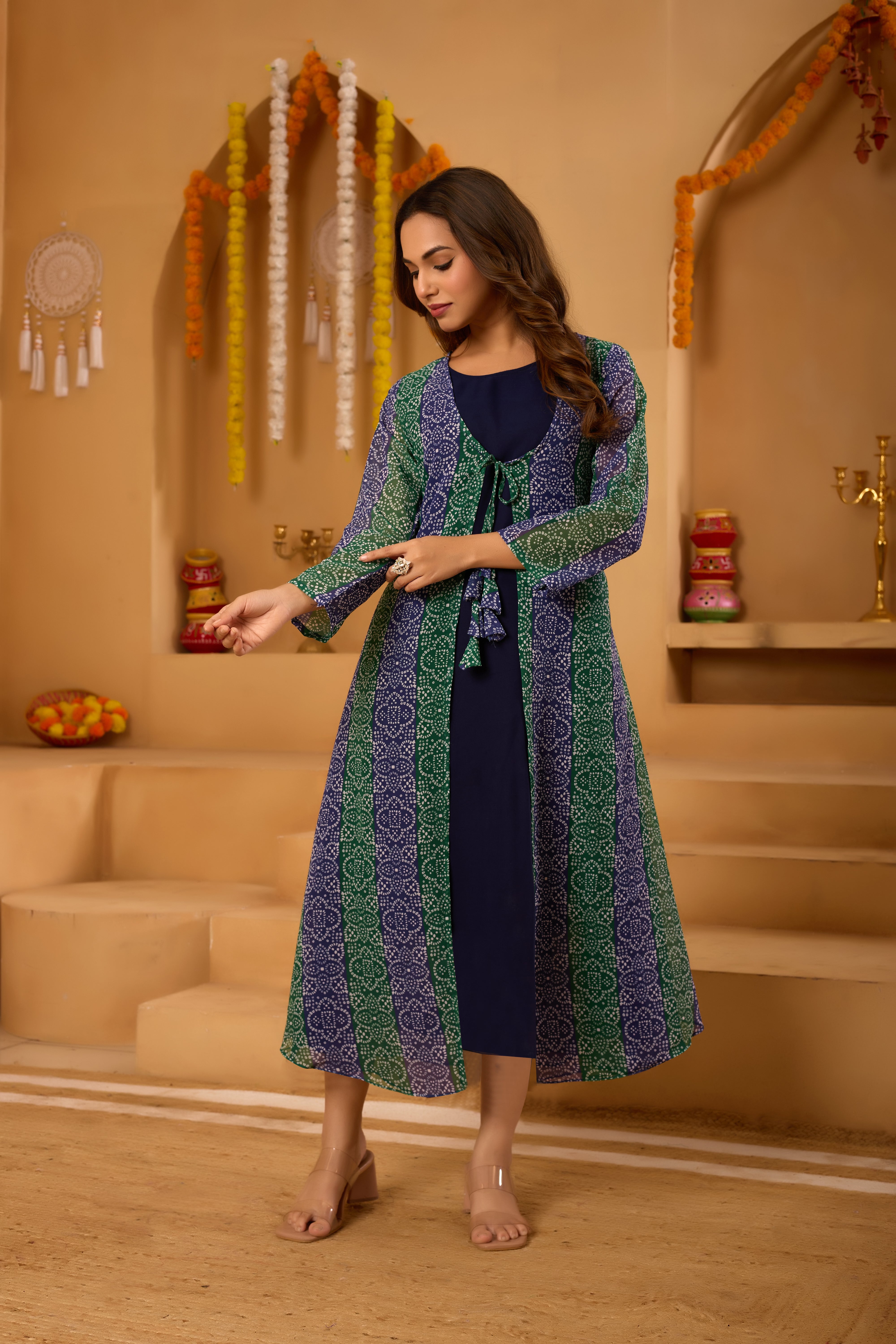 Refresh your festive and casual wardrobe with this elegant Mint Green Bandhni Shrug Set, crafted to offer effortless style and comfort. Made from premium heavy georgette fabric, the outfit drapes beautifully while remaining light and breathable.