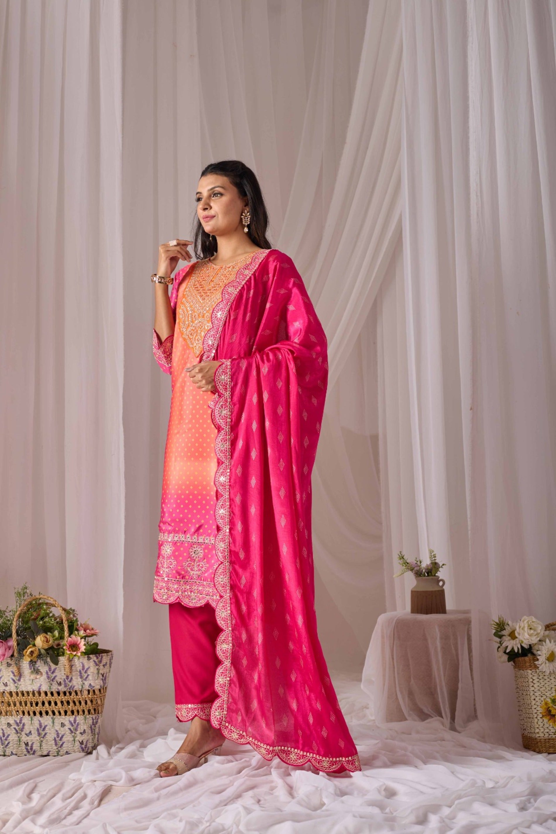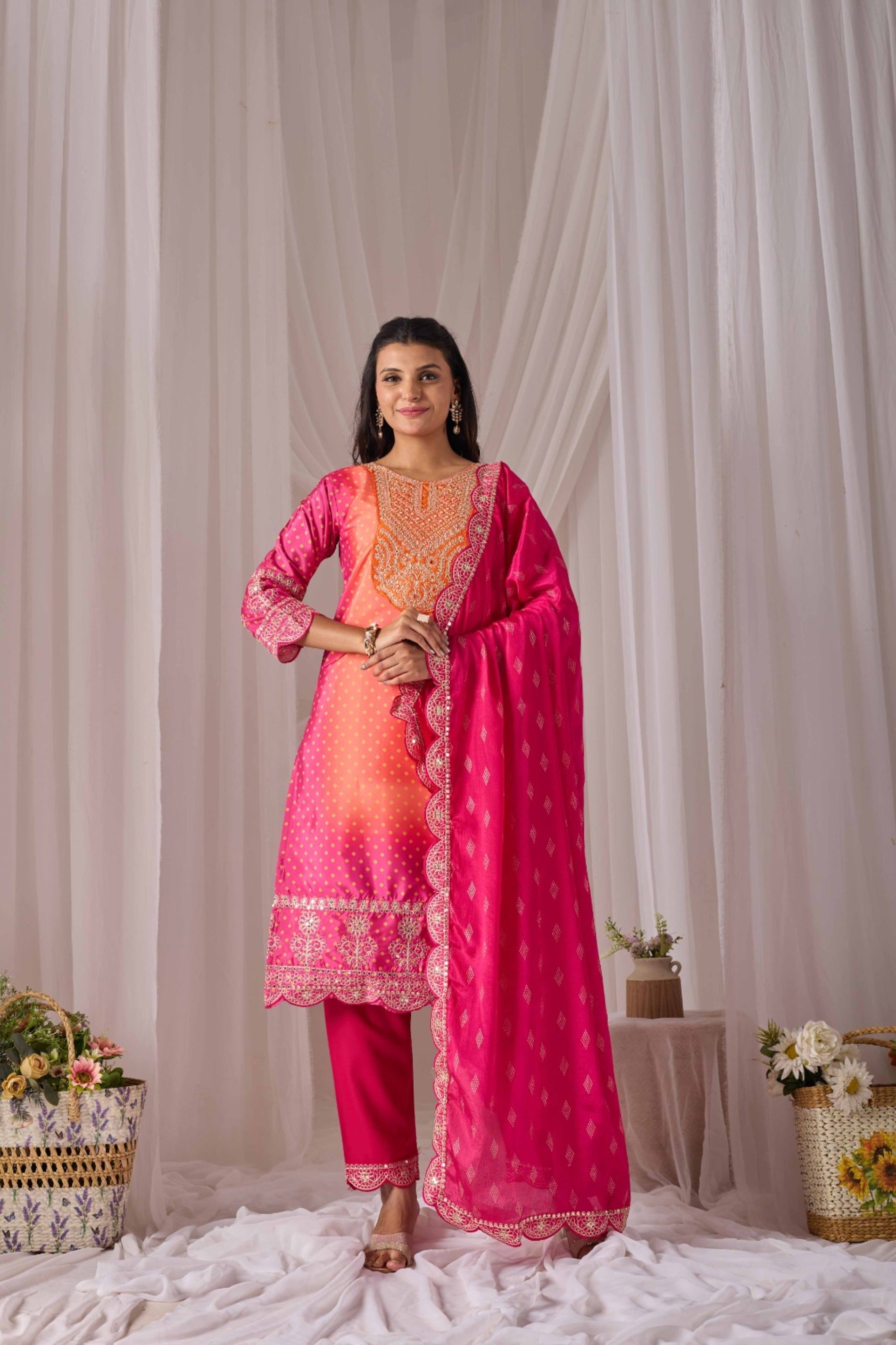 The set includes a graceful kurti, matching bottom, and dupatta. The dupatta features four-side embroidered borders with full print, adding a regal finishing touch that complements the vibrant orange hue beautifully.