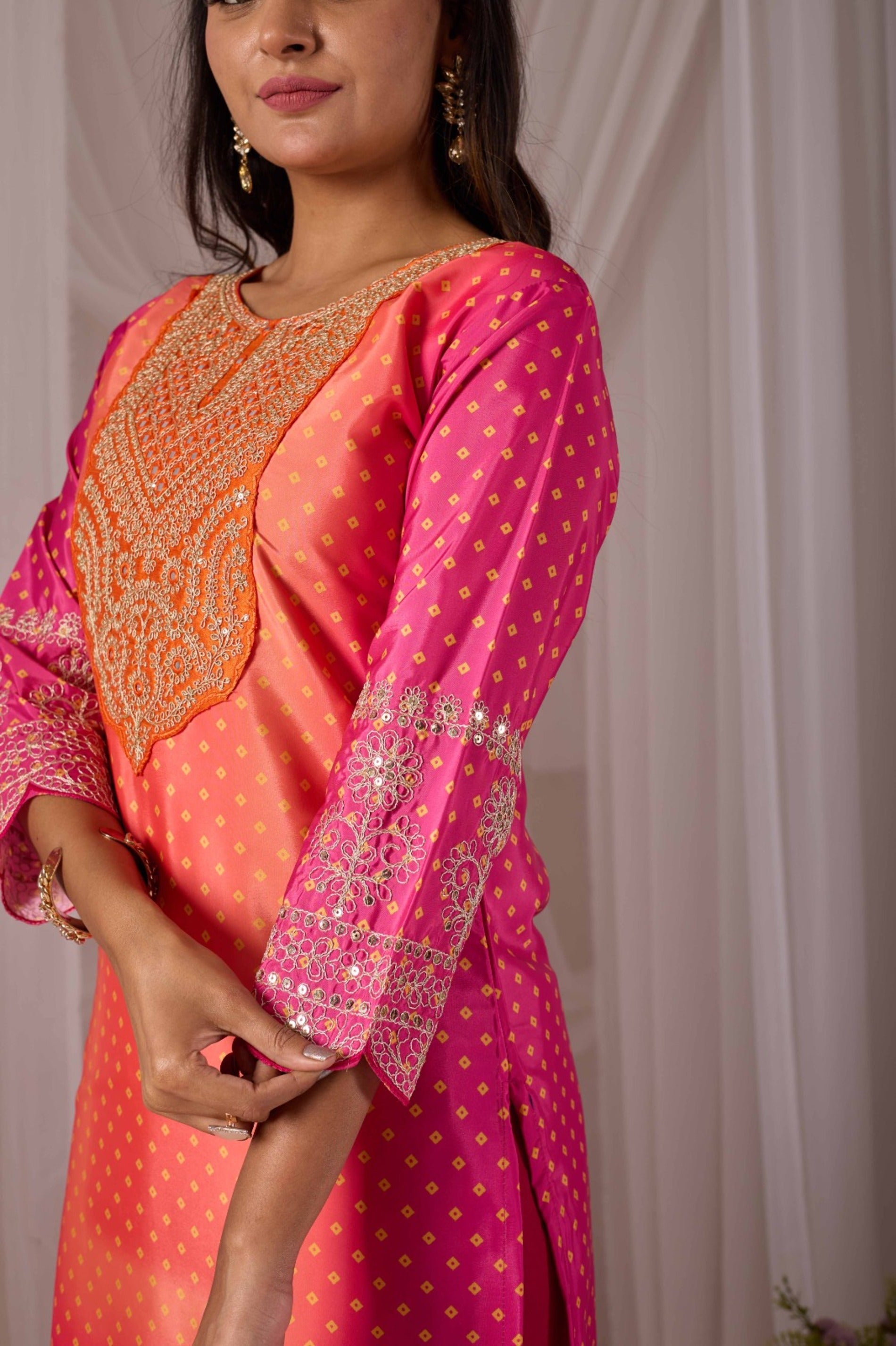 Turn heads with the vibrant Orange Padding Set, crafted from premium French silk that exudes elegance and a rich, smooth texture. The ensemble is adorned with heavy sequin embroidery and multi-thread work, giving it a luxurious and festive charm.